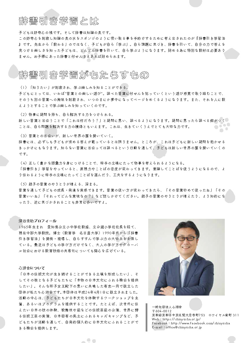 三笠宮彬子女王殿下主宰「心游舎」 ★深谷式 辞書引き学習ワークショップ開催のお知らせ