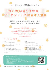 そこで、この度心游舎では辞書引き学習法を考案した深谷圭助先生を講師にお迎えし、岩津天満宮にて辞書引き学習ワークショップを開催する運びとなりました。